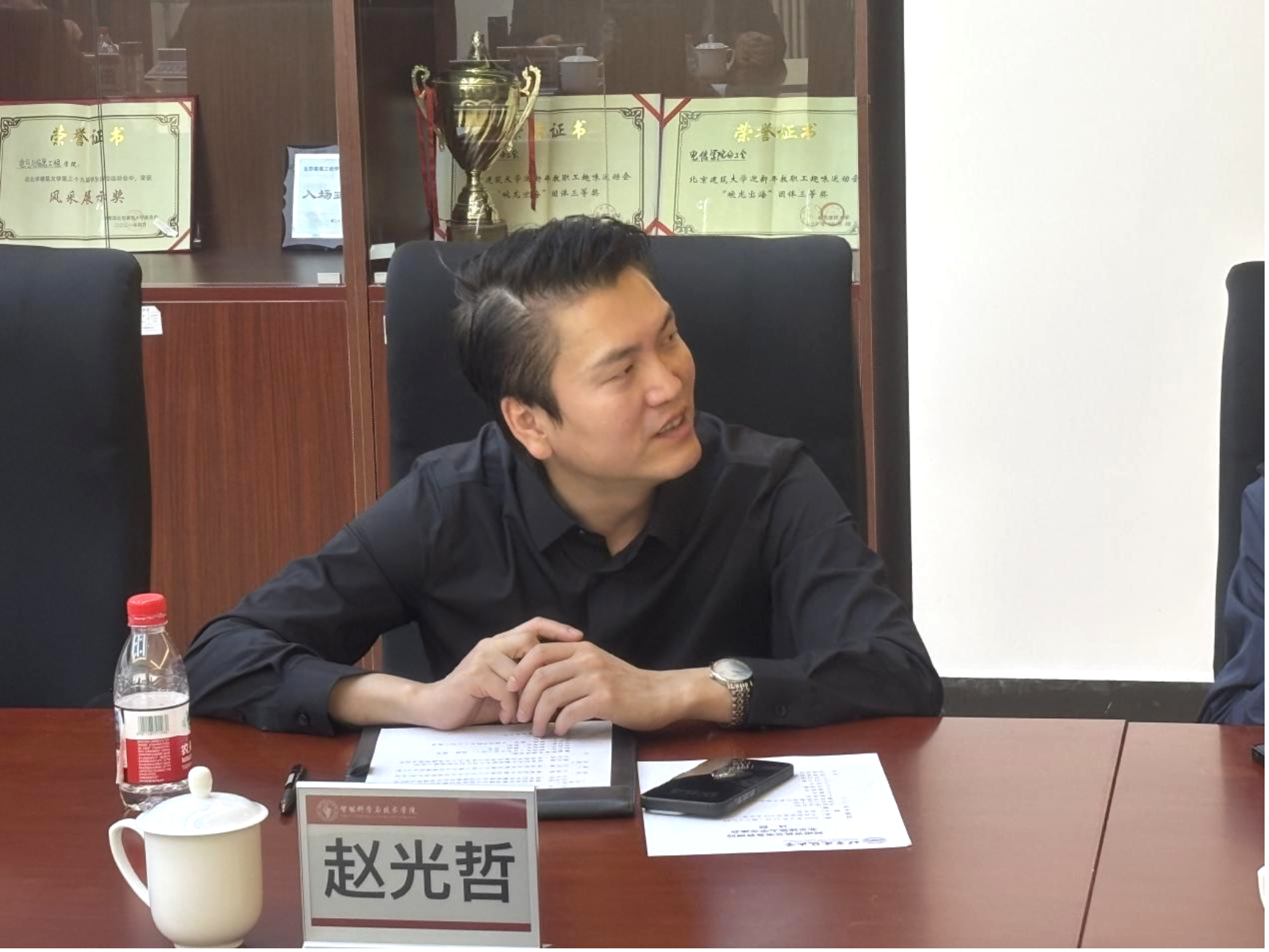 赵光哲对靳源一行的到访表示热烈欢迎,并介绍了18禁在智能服务、智慧能源管理等领域的学科特色与发展优势。他表示,学院高度注重建筑智慧能源管理和建筑园区智慧运维的科研攻关,坚持以学科前沿技术赋能实践应用,主动聚焦政府机关工作中的难点、堵点问题提供技术支撑与解决方案。他希望,以此次交流为契机,进一步深化与河南省机关事务管理局后勤保障中心在成果转化、技术应用等方面的深入合作,推动校地优势互补、协同发展。